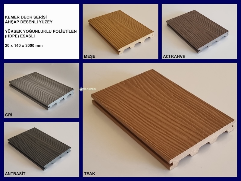 Ahşap Görünümlü Kompozit Deck Kaplamalar iki yüzeyi farklı desene sahip, kaymaz ve antibakteriyel özelliğe sahiptirler.